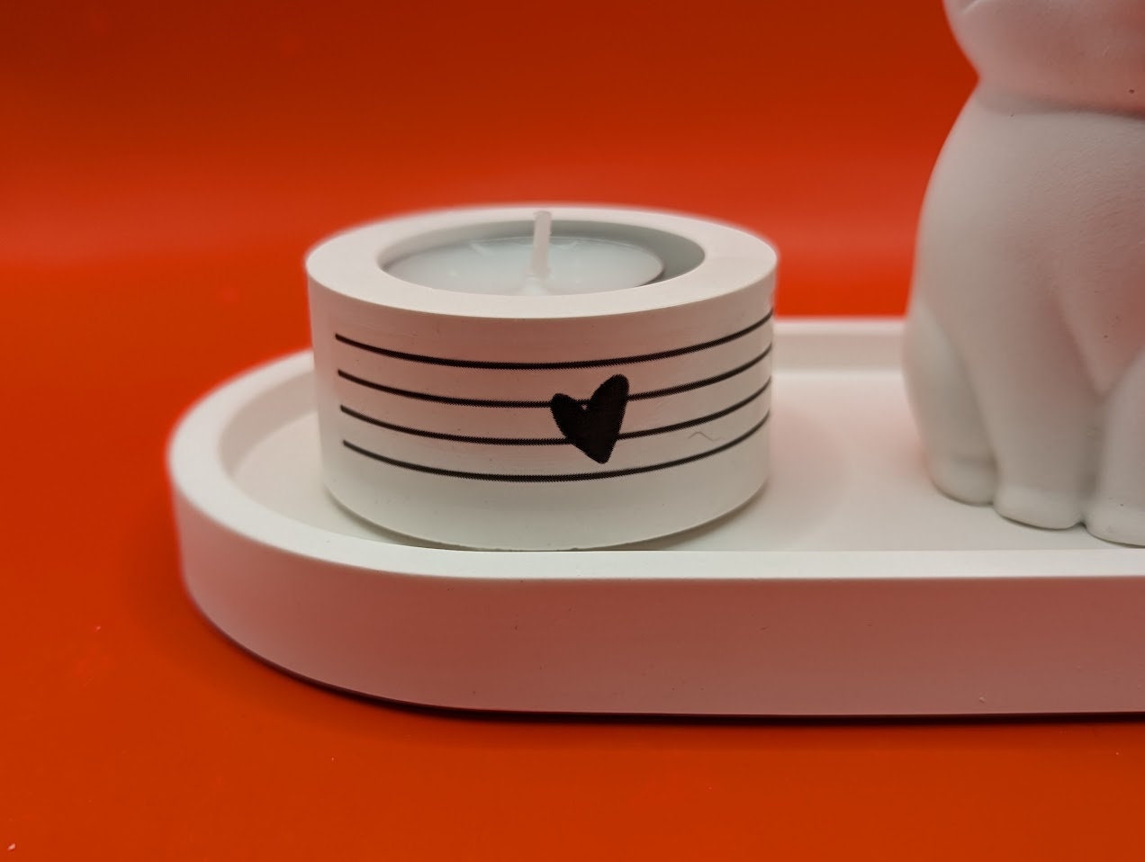 Die Katze schaut so super sweet..... Beide stehen auf einem Tablet auch aus Gips. Auf dem Teelichthalter ist ein Herz mit Wasserschiebfolie angebracht.